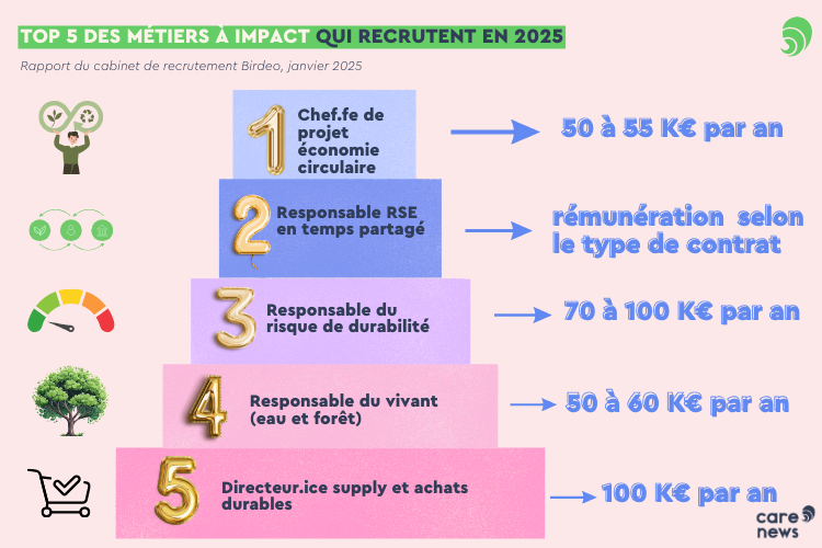 Chef.fe de projet économie circulaire, responsable RSE en temps partagé… Pour la septième année consécutive Birdeo publie son Top 5 des métiers à impact qui recrutent en 2025.
