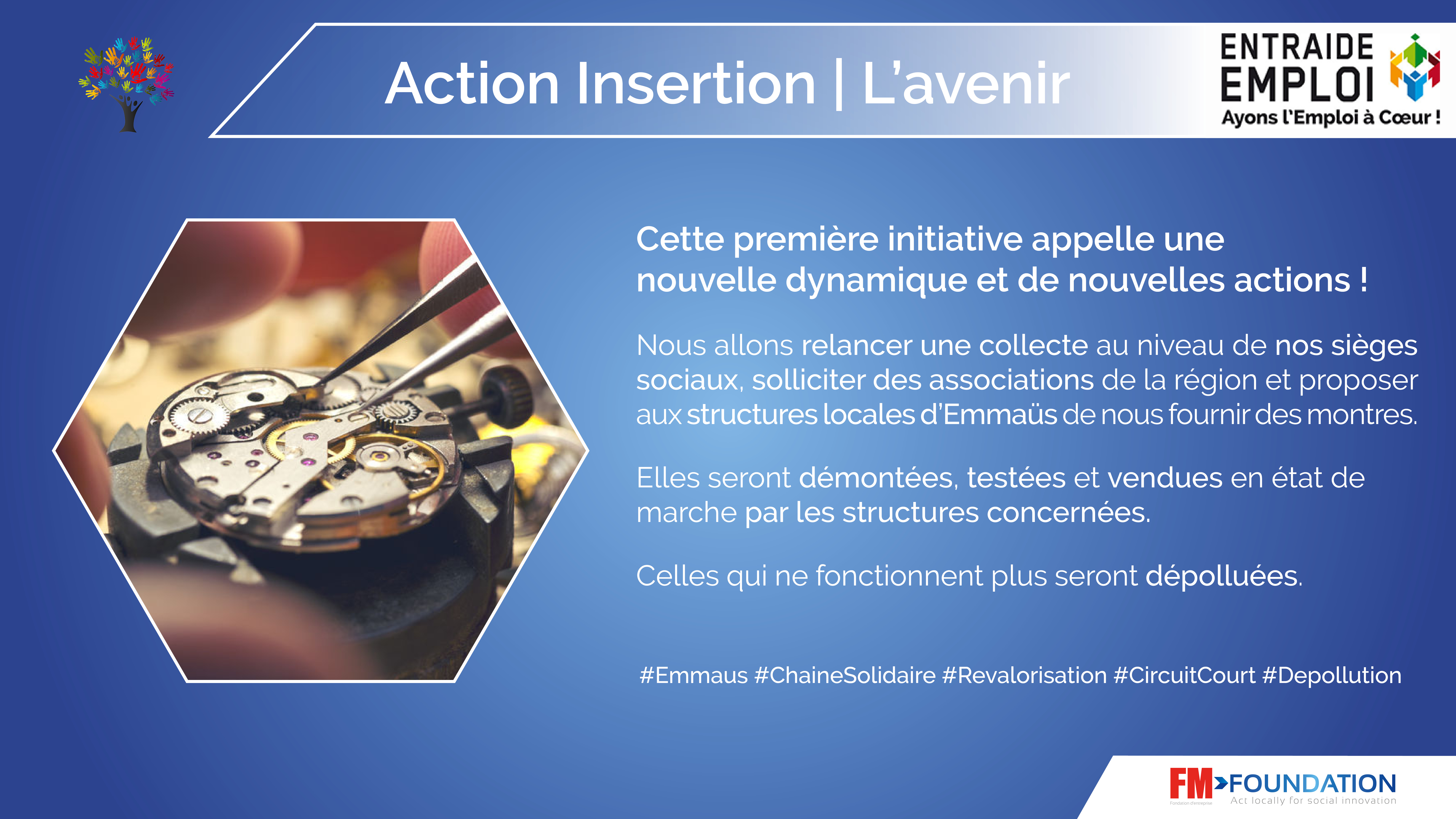 Sept collaborateurs de Entraide Emploi se sont portés volontaires pour être formés au démontage de montres, changement des piles et remplacement des bracelets. FM Foundation finance les consommables nécessaires à ces réparations. Vingt-huit montres ont ainsi été réparées. Les douze montres restantes, irréparables, ont été démontées, les piles enlevées, les bracelets triés et l'ensemble remis en déchetterie afin d'être valorisé.