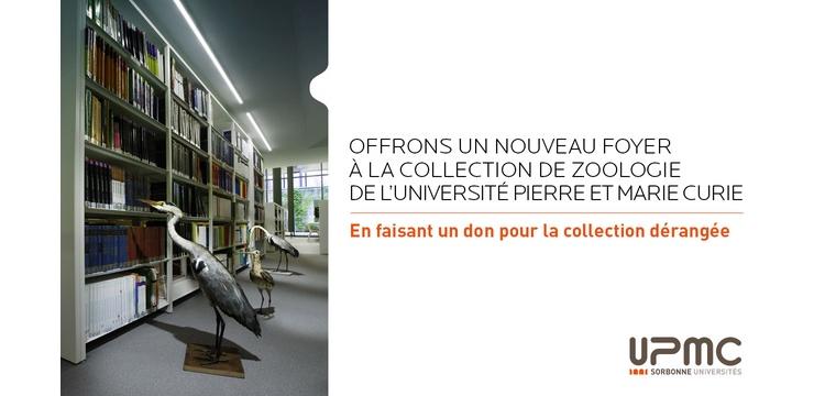La récente rénovation du campus Science et Médecine de l'UPMC a contraint la collection de zoologie de l'université de quitter ses anciens locaux. C'est afin d'aider les animaux naturalisés à trouver leur place dans leur nouvel environnement que la Fondation partenariale de l'UPMC a lancé une campagne de levée de fonds sur Ulule. L'objectif est de collecter 15 000 €, qui permettront de financer la scénographie de la salle de la collection pédagogique (conception et agencement de mobilier et décors, création de supports multimédias...). Si cet objectif initial est dépassé, l'UPMC utilisera les fonds supplémentaires pour acquérir du matériel muséographique.