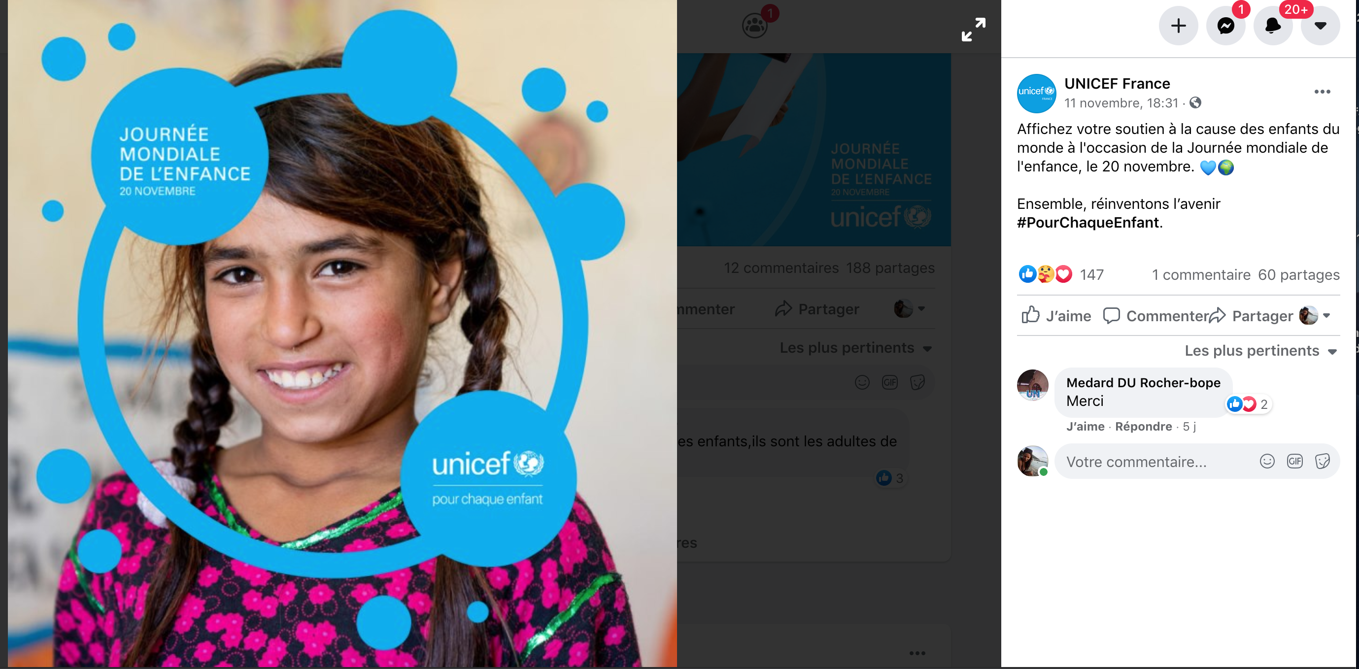 - Sur Facebook, vous pourrez partager vos plus beaux souvenirs d’enfance en participant au challenge #MonPortraitEnfant. Autre possibilité pour vous investir plus simplement, changer votre décor de profil avec le profil personnalisé bleu d’UNICEF France.