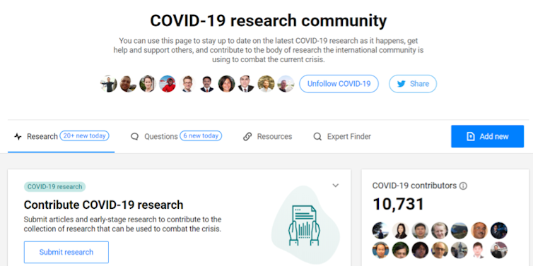 Par exemple, dans le réseau social ResearchGate, la communauté de scientifiques COVID-19 research community s’est créée le 17 mars dernier et rassemblait 28 jours plus tard plus de 10 700 membres, publiant plus de 40 papiers par jours en moyenne.