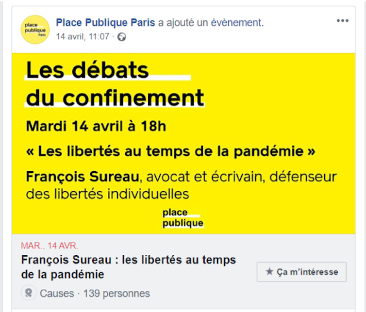 Le mouvement politique Place publique invite lui sa communauté à rejoindre « les débats du confinement » chaque mardi soir lors d’un évènement Facebook.