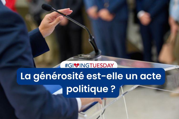 Une personne en costume s'exprime derrière un pupitre muni d'un micro, surmontée du logo #GivingTuesday et de la question : « La générosité est-elle un acte politique ?