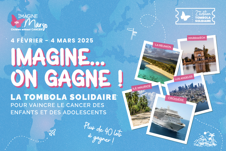 Chaque année, 2 500 enfants et adolescents sont diagnostiqués d’un cancer en France, et pour 20 % d’entre eux, il n’existe aucune solution thérapeutique viable. Face à cette réalité, Imagine for Margo organise, du 4 février au 4 mars 2025, la 2ᵉ édition de la tombola solidaire "Imagine… on gagne !". Cet événement permet de soutenir la lutte contre les cancers pédiatriques tout en offrant la chance de remporter plus de 40 lots d’exception : séjours de rêve, croisières, billets d’avion et bien plus encore. En participant, chacun peut faire avancer le combat contre le cancer des enfants et offrir aux jeunes patients un avenir plus serein. Un ticket, c’est un espoir de plus.
