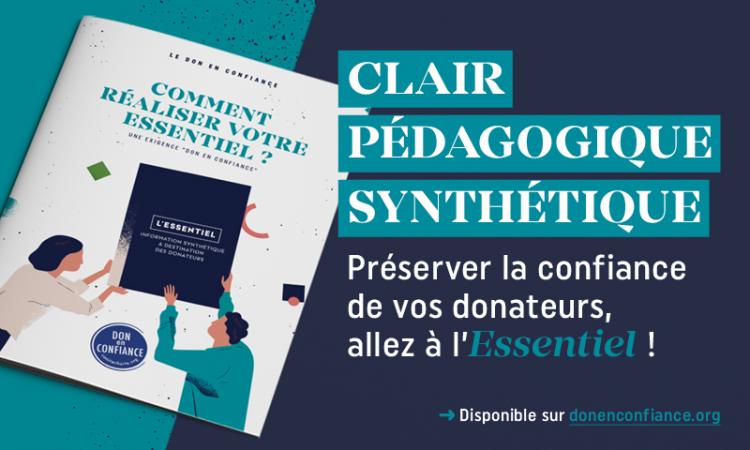 Ce document de communication est devenu la référence de la transparence vis-à-vis des donateurs, y compris pour les organismes de contrôle étatiques, dont le secteur de la générosité s’est depuis emparé. Attentif à son rôle de garde-fou et soucieux de la baisse alarmante de la confiance des Français envers les organisations faisant appel public à la générosité (Observatoire de la confiance 2020), le Don en Confiance a fait le choix de rendre accessible la réalisation d’un Essentiel à toute organisation concernée, labellisée ou non. Cette action est d’autant plus significative qu’elle est réalisée au lendemain d’un élan de générosité très important dans le contexte du Covid et quelques mois après la publication d’un rapport de la Cour des Comptes sur l’importance de la transparence et de la communication dans la gestion des dons par les associations et fondations.