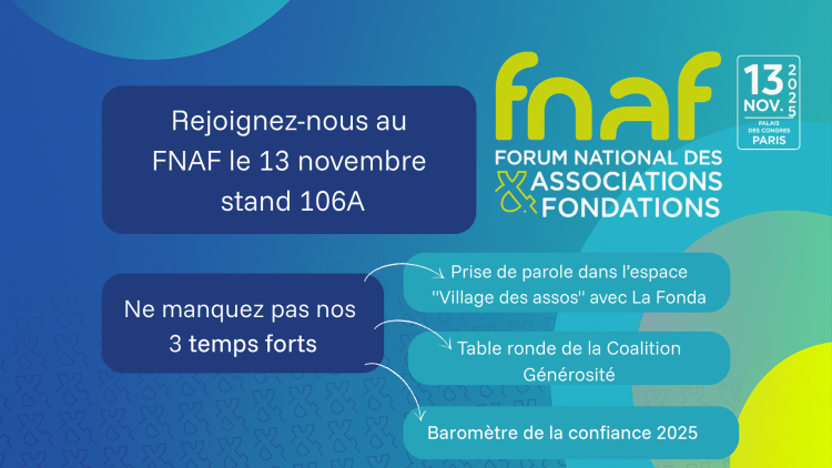 Le compte à rebours est lancé : rendez-vous au FNAF avec Don en Confiance Organisé le 13 novembre 2025 au Palais des Congrès de Paris, le Forum national des associations et fondations (FNAF) est le grand rendez-vous annuel de celles et ceux qui font vivre l’engagement associatif. L’événement réunit chaque année plus de 5 000 participants : dirigeants d’associations, fondations, mécènes, partenaires publics et médias. Don en Confiance y prendra part pour échanger autour des enjeux de transparence, de gouvernance et de confiance au cœur de l’économie sociale et solidaire (ESS).