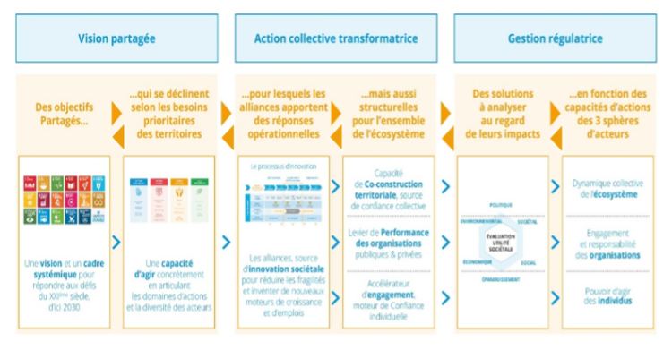 Naturellement, ce mode opératoire n’est pas une « boite à outils » miracle, et encore moins un « cadre normatif » enfermant vers un modèle qui serait vertueux par nature. C’est bien au contraire un chemin de (re)découverte de sa propre valeur et d’apprentissage de son intégration dans un écosystème plus large que celui que nous pratiquons aujourd’hui. Chacun peut ainsi choisir l’angle le plus pertinent pour lui dans son contexte et dans celui du Territoire au sein duquel il agit. Le défi est en effet d’apprendre à mieux articuler l’agilité de l’action de chacun avec le cap et le cadres communs qui s’imposent à tous afin de « faire Société ». C’est le sens même de la notion d’intérêt général, dont le concept a été inventé en France en 496 lors de la fondation de l’Europe[6].