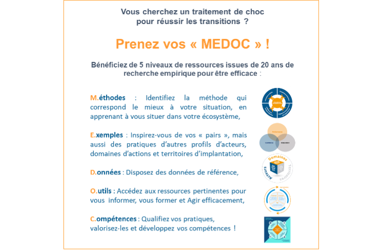 Un an plus tard, à l’occasion de ses 20 ans, notre laboratoire de recherche empirique va plus loin en diffusant la « cartographie des MEDOC des Transitions » … autrement dit des Méthodes, Exemples, Données, Outils et Compétences qui ont fait leurs preuves pour (re)définir une trajectoire d’actions à la hauteur de nos défis communs. Au moment où tous les équilibres socio-économiques sont questionnés, et où les défis environnementaux n’ont jamais été aussi complexes, il est urgent de tirer les enseignements de deux décennies d’observations et d’expérimentations du mouvement de co-construction du bien commun. Les enjeux sont clairs : apprendre à articuler progrès social, équilibre économique et préservation écologique. Une utopie ? Pas pour tous ! De nombreux exemples inspirants montrent qu’il est possible de réussir cet assemblage gagnant. C’est au cœur des Territoires qu’il est possible de l’observer, de le qualifier, de le modéliser et de le déployer.