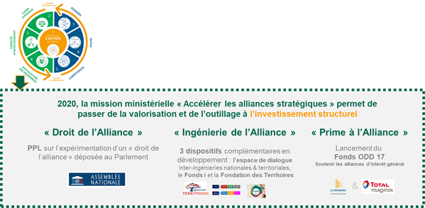 Pour un déploiement efficace de notre capacité collective à faire alliance, il était nécessaire qu’il y ait une réelle impulsion politique sur les enjeux adressés par la co-construction du bien commun. Cela commence par la valorisation de l’action de terrain des alliances d’intérêt général déjà ancrées sur les territoires. Les résultats de la mission ministérielle remis au Ministre le 7 mai 2020 en a marqué une étape structurante. Plus d’une centaine d’organisations publiques et privées, nationales et territoriales, se sont mobilisées autour de la Députée Cathy RACON-BOUZON et de Charles-Benoît HEIDSIECK, Président-fondateur du RAMEAU, pour porter une parole commune sur les besoins et les solutions existantes (cf. état des lieux des partenariats, note de synthèse de la mission, et kit « l’ODD 17 en pratique »).