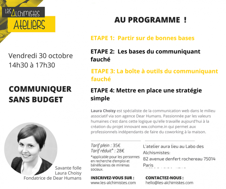 Etape 1: Partir sur de bonnes bases Etape 2: Les Bases du communiquant fauché Etape 3: La boîte à outils du communiquant fauché Etape 4: Mettre en place une stratégie simple Laura Choisy est spécialiste de communication web dans le milieu associatif via son agence Dear Humans: http://dearhumans.fr/. Passionée par les valeurs humaines, c'est dans cette logique qu'elle travaille aujourd'hui à la création du projet innovant www.cohome.in qui permet aux professionnels indépendants de faire du coworking à la maison.