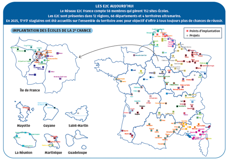 En 2025, le Réseau E2C France a continué son développement avec l’ouverture d’une E2C à Montargis et d’un nouveau site à Poitiers. Il compte désormais 58 E2C, réparties sur 152 sites dans 12 régions, 68 départements et 4 territoires ultramarins. Les financements n’ont cependant pas permis d’ouvrir en 2025 de nouveaux établissements dans des territoires où des besoins ont pourtant été identifiés, comme Aix-en-Provence, la Guadeloupe ou Vesoul.