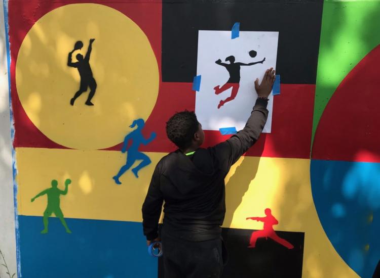 En utilisant deux techniques liées à l’art urbain, la géométrie et le pochoir, les participants ont créé une composition abstraite. En se servant de plusieurs formes géométriques telles le rond, le carré ou encore le rectangle, cette composition forme leur « terrain de jeu » pour intégrer des silhouettes d’hommes et de femmes pratiquant une discipline sportive. Pour donner de la couleur à leur réalisation, la gamme chromatique choisie est celle qui appartient au symbole olympique : jaune, rouge, bleu, vert et noir.