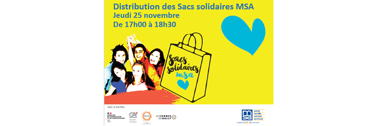 Dans le cadre d’un partenariat avec la CCMSA*, SOLAAL contribue à la distribution de sacs solidaires portée par la MSA (Mutualité sociale agricole) Ile-de-France, qui souhaite donner un coup de pouce financier et moral post-COVID pour les apprentis et étudiants des centres de formation et d’apprentissage franciliens.